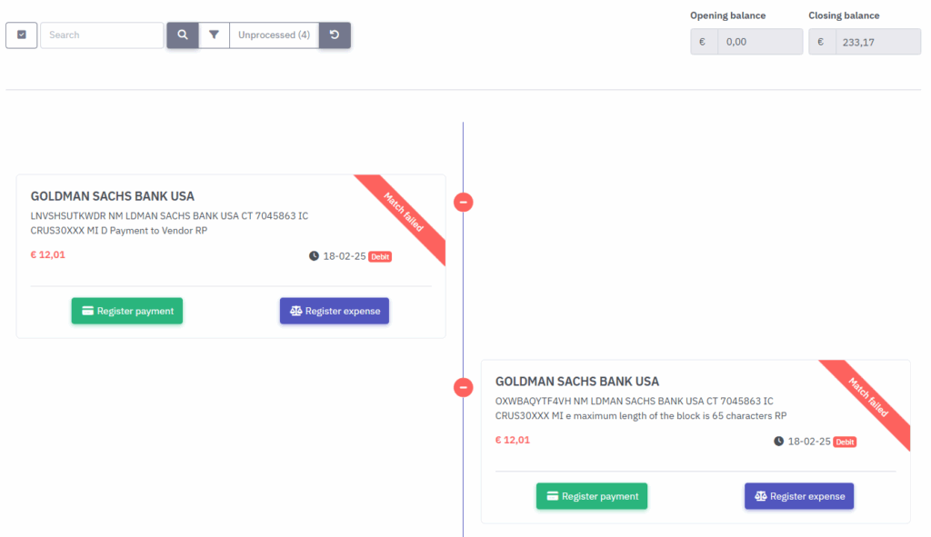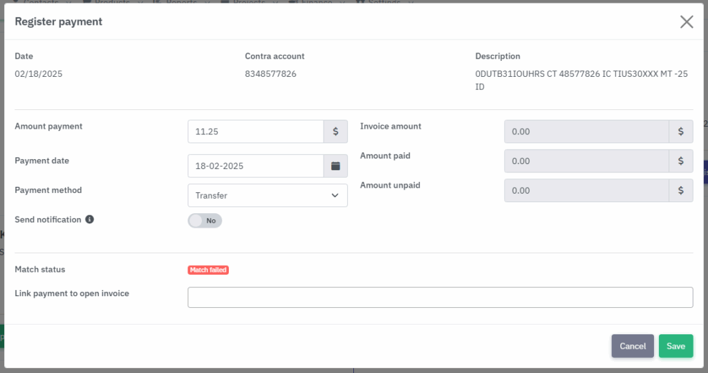 Easily register payments for all your bank statement lines expenses and income. When connect the payment to an invoice or purchase, the document account status is directly set to paid.