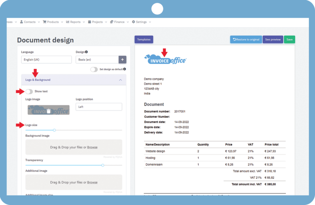 If you are sure that you are using the correct style template, then we have to check the document design settings. For that we have to go to Settings > Documents > Document design and open the selected document design.